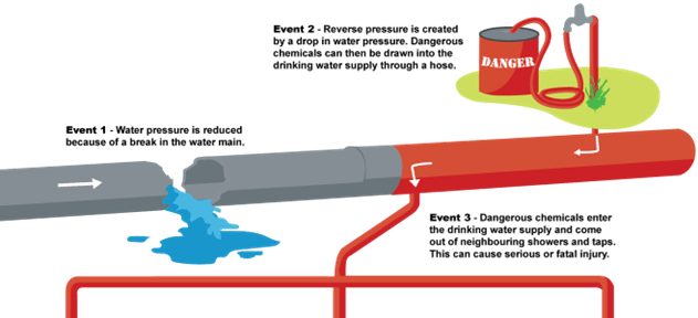 Typically, water will flow from the public water supply to the consumer’s plumbing distribution system. Backflow is the undesirable reversal of this flow of water and undesirable substances from the non-potable source to the potable source.